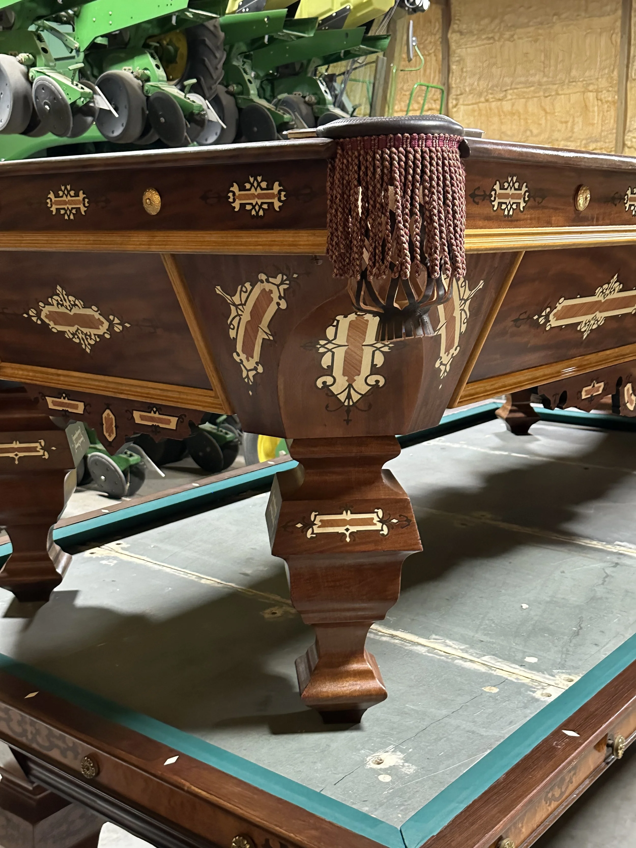 Sold. 4 1/2’ x 9’ Pool Table. Main body of the table is mahogany with black ebony and maple inlays. The small center detail is tulip wood. Walnut used in the crest and rosewood upper rails.